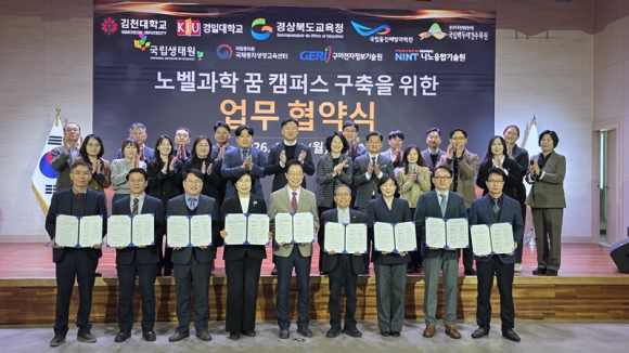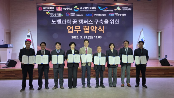 김천대학교(총장 윤옥현)는 23일 경상북도교육청(교육감 임종식)을 비롯해 경일대, 국립울진해양과학관, 국립백두대간수목원, 국립생태원 멸종위기종복원센터, 국립종자원, 국제종자생명교육센터, 구미전자정보기술원, 포항공대 나노융합기술원 등 9개 기관과 ‘노벨과학 꿈 캠퍼스’ 운영을 위한 다자간 업무협약을 체결했다.
