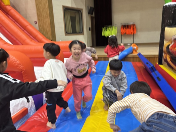 이날 강당에는 대형 미끄럼틀을 비롯하여 김천 지역의 특색을 살린 김밥 에어바운스와 수박 에어바운스 등 다양한 놀이 시설이 설치되어 유아와 초등학생이 함께 즐길 수 있는 환경이 조성되었다. 특히 유아와 초등학생이 한 공간에서 어울려 놀이하며 서로를 배려하고 협력하는 경험을 쌓았으며, 이러한 상호작용은 유아들에게는 초등학교에 대한 심리적 안정감을, 초등학생에게는 배려와 책임의 태도를 기르는 계기가 되었다.