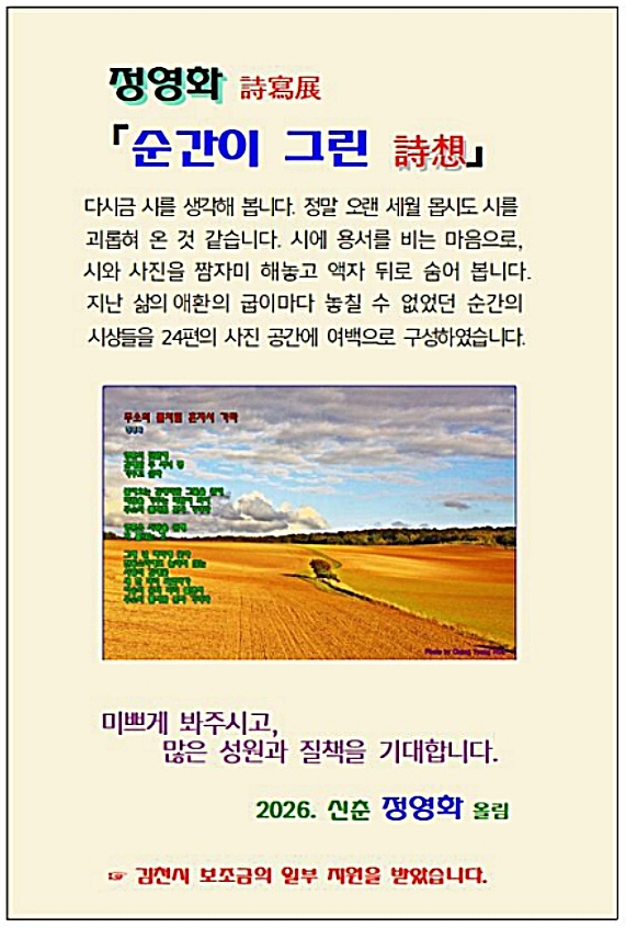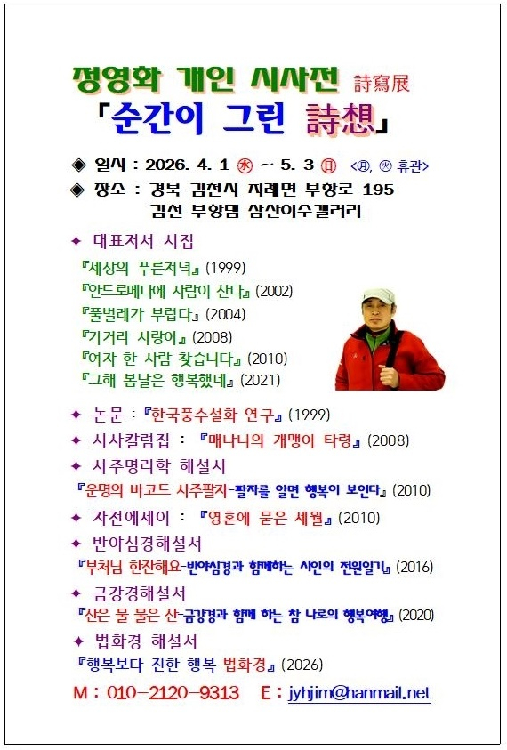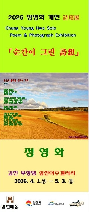 김천 출신 시인이며, 작가인 정영화의 개인 시사전(詩寫展) 「순간이 그린 시상(詩想)」이 2026. 4. 1일부터 5. 3일까지 김천 부항댐 물문화관 삼산이수갤러리에서 열린다.