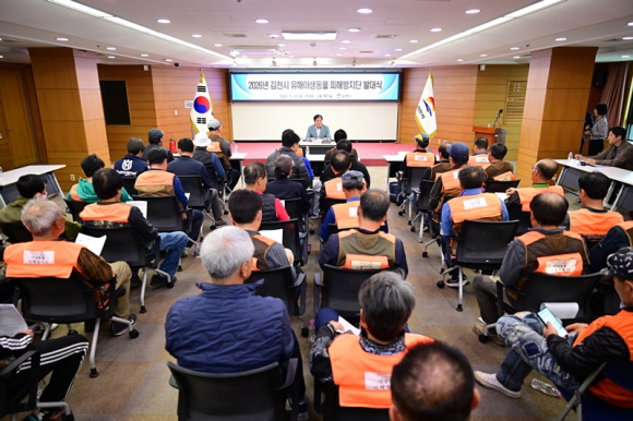 김천시는 3월 27일 시청 2층 회의실에서 야생 멧돼지, 고라니 등 유해야생동물로 인한 농작물 피해를 예방하고 아프리카돼지열병(ASF)의 지역 사회 확산을 차단하기 위해 ‘2026년 유해야생동물 피해방지단 발대식’을 개최했다고 밝혔다.
