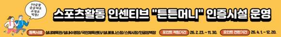 김천시시설관리공단(이사장 김재광)이 작년에 이어 올해도 체육시설 스포츠활동 인센티브 “튼튼머니” 인증시설을 운영한다고 밝혔다.