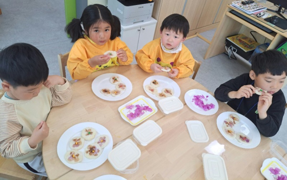 유치원과 1. 2학년 언니 오빠들이 직접 쌀가루로 반죽도 해보고 예쁜 봄꽃으로 둥근 모양, 위에 예쁜 꽃으로 꾸며보고 맛있게 구워보았다. 여러 모양의 (진달래. 개나리. 제비) 꽃을 올려 자연의 봄을 한 상 가득 교실로 옮겨 놓은 것 같았다. 맛있는 꽃 화전으로 체험활동을 즐겁게 한 유치원 친구들과 언니 오빠들은 함께 만든 꽃 화전으로 친구들과 나눠 먹고 부모님께 드리고 싶다고 하여 하나씩 넣어서 가지고 가게 했다.