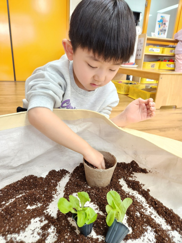 유아들은 먼저 충분히 흙을 자유롭게 만지며 촉감 놀이 후 모종의 색, 크기, 모양을 탐색하고 상추와 케일 모종을 직접 심었다. 또한 물을 듬뿍 주며 모종과 이야기 나누며 상호작용하는 시간을 가졌다.