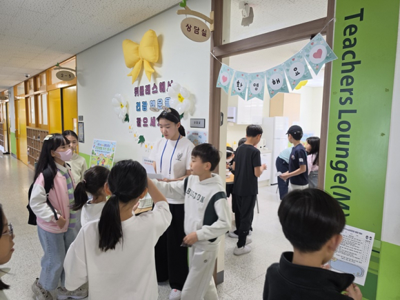 학생들이 점심시간을 활용해 자발적으로 참여하고 즐길 수 있는 ‘건강생활 퀴즈 O,X' 형식으로 진행되었으며 퀴즈를 풀고 나만의 마음 챙김 방법을 적어보는 활동도 함께 진행 되었다. 특히 신학기 적응 기간을 마친 학생들이 자신의 신체 건강뿐만 아니라 정서적 건강(마음 돌봄)까지 돌아볼 수 있도록 세심하게 구성된 것이 특징이다. 이번 행사의 백미는 학생회 선배들이 동생들의 퀴즈 답안을 직접 확인하고, 틀린 퀴즈에 대해 1:1로 친절하게 설명해주는‘멘토링 운영’이었다. 저학년 후배들이 O,X 퀴즈를 풀고 나면, 고학년으로 구성된 학생회 회원들이 "이 퀴즈는 왜 O일까?", "선배는 이렇게 실천하고 있어"라며 건강 생활의 구체적인 방법을 후배들의 눈높이에서 알기 쉽게 풀어주었다. 단순히 정답을 확인하는 과정이 아닌, 선배들의 따뜻한 설명과 격려를 통해 동생들은 오답을 배움과 성장의 기회로 삼을 수 있었다.