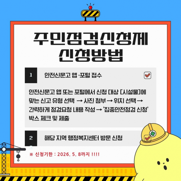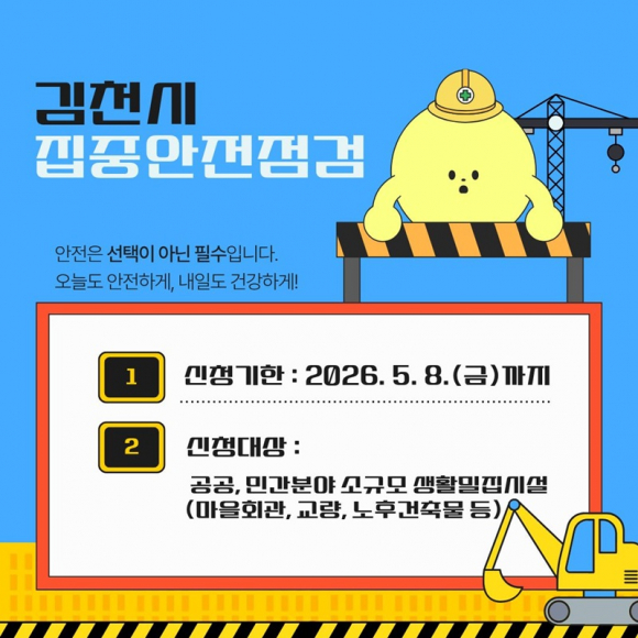 김천시(김천시장 권한대행 조현애 부시장)는 안전취약시설의 위험 요인을 사전에 점검하여 안전사고를 예방하고자 4월 20일부터 6월 19일까지 ‘2026년 집중안전점검’을 실시 한다.