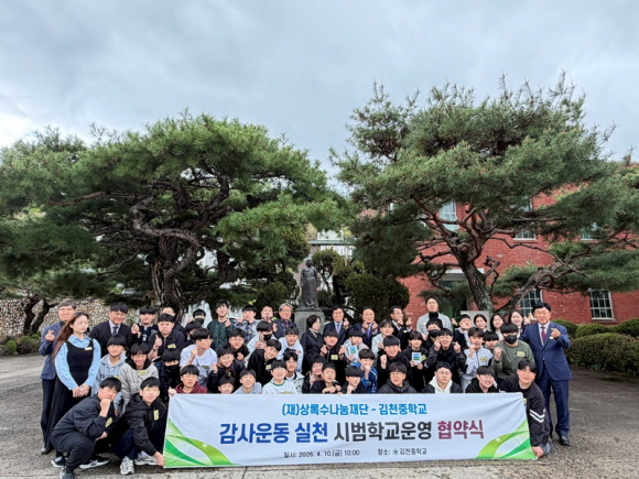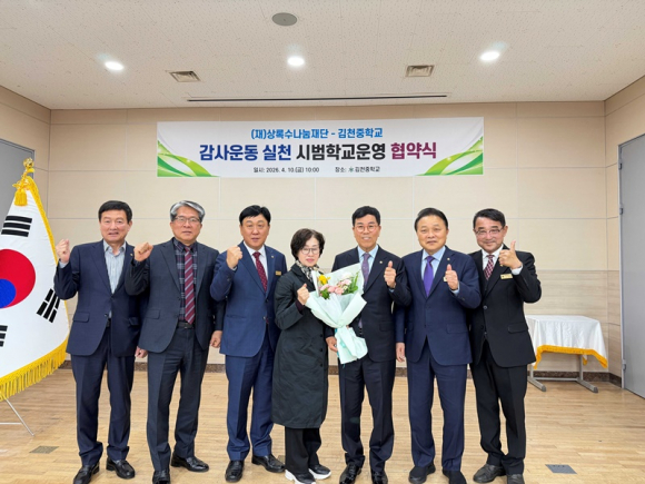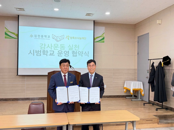 김천중학교(교장 장영규)와 상록수나눔재단(이사장 이상춘)은 4월 10일(금) 김천고등학교 B1 대강의실에서 ‘감사운동 실천 시범학교’ 운영을 위한 업무협약(MOU)을 체결했다. 이번 협약은 학생들의 바른 인성과 공동체 의식을 함양하고, 감사와 나눔의 학교문화를 확산하기 위해 마련되었다.