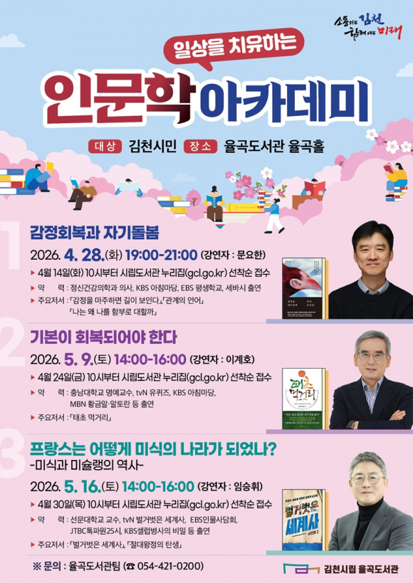 이번 프로그램은 감정, 건강, 음식문화 등 우리 일상과 밀접한 주제를 중심으로 기획됐으며, 시민들이 실질적으로 공감하고 삶의 균형을 찾을 수 있도록 돕는 세 개의 강연으로 구성되었다. 첫 번째 강연은 4월 28일(화) 오후 7시, 정신건강의학과 전문의 문요한 의사가 ‘감정회복과 자기돌봄’을 주제로 문을 연다. 일상 속에서 마주하는 다양한 감정을 이해하고 이를 건강하게 회복하는 구체적인 방법을 제시할 예정이며, 참가 신청은 4월 14일(화)부터 접수한다. 두 번째 강연은 5월 9일(토) 오후 2시, 이계호 교수가 ‘기본이 회복되어야 한다’는 주제로 강단에 선다. 건강한 삶을 지탱하는 근본적인 요소와 올바른 생활습관의 중요성을 전달하며, 참가 신청은 4월 24일(금)부터 가능하다. 마지막 세 번째 강연은 5월 16일(토) 오후 2시, 임승휘 교수가 ‘프랑스는 어떻게 미식의 나라가 되었나’를 주제로 음식문화의 역사 속에 담긴 인문학적 통찰을 제공한다. 참가 신청은 4월 30일(목)부터 시작된다. 율곡도서관(관장 이신기)은 “이번 인문학 아카데미가 시민들이 일상에서 자신을 돌아보고 삶의 균형을 찾는 계기가 되기를 바란다.”라며, “많은 시민의 관심과 참여를 기대한다.”라고 밝혔다. 한편, 강연은 율곡도서관 율곡홀에서 진행되며 지역 주민 누구나 참여할 수 있다. 신청은 강연 회차별 일정에 맞춰 김천시립도서관 누리집(www.gcl.go.kr)을 통해 선착순으로 접수하면 된다.