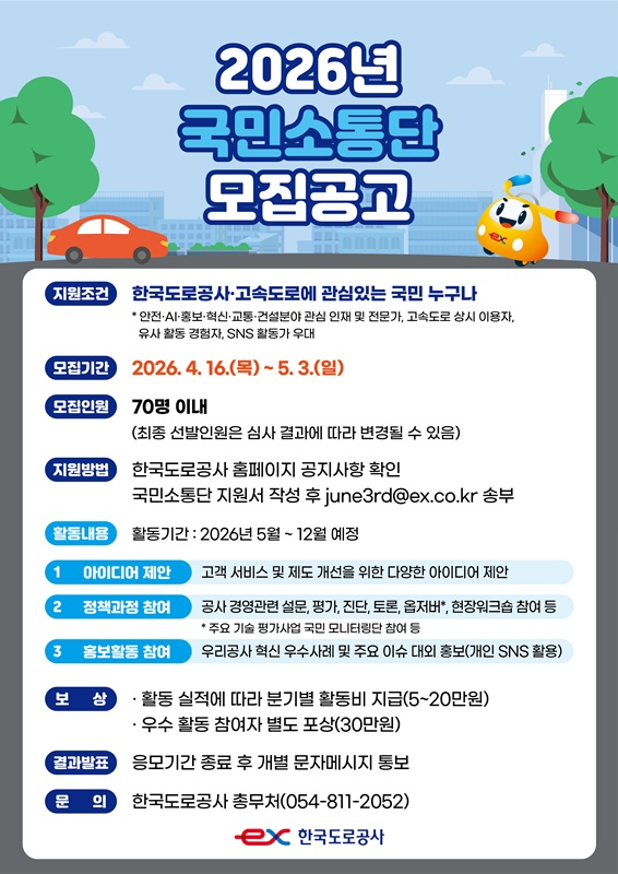 한국도로공사(사장 직무대행 이상재)는 고속도로 서비스 향상을 위해 국민의 의견을 정책에 반영하는 ‘한국도로공사 국민소통단’을 4월 16일(목)부터 5월 3일(일)까지 모집한다고 밝혔다.