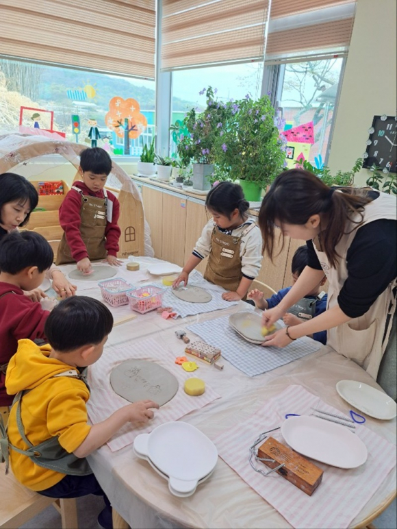 도자기(접시) 만들기 체험을 하면서 흙을 만지고 느끼며 촉감 교육과 자기만의 접시를 만들며 즐겁고 재미있는 시간을 가졌다.
