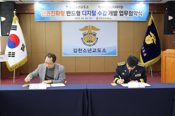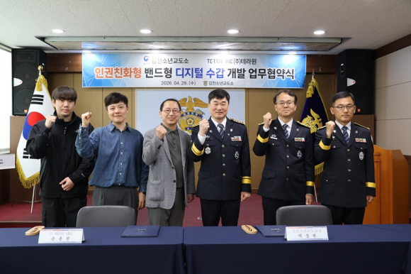 김천소년교도소(소장 백성현)는 4월 29일 13시, 디지털 헬스케어 및 보안 솔루션 전문 기업인 ㈜테라원(대표 손봉찬)과 ‘인권친화형 밴드형 디지털 수갑 개발’을 위한 업무협약식(MOU)을 가졌다.