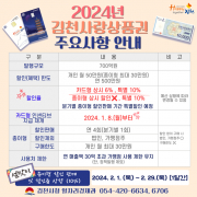 김천시는 2024년 김천사랑 상품권을 700억 원 규모로 발행하여 운영한다고 밝혔다. 김천시는 2023년까지 할인율 10%를 유지했으나 2024년부터는 카드형 상시 할인율 6%, 특별할인 10%(분기별 1회)로 운영할 방침이다. 다만 개인별 구매 한도 월 50만 원, 연 500만 원의.. [ 2023년 12월 27일]