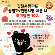 김천시는 침체된 상권 소비 촉진과 전통시장 이용 증대로 지역경제 활성화를 위해 오는 10월 25일부터 10월 27일까지 3일간 상점가‧전통시장에서 김천사랑카드 이용시 추가할인 10%를 해주는 특별 이벤트를 진행한다고 밝혔다... [ 2024년 10월 22일]